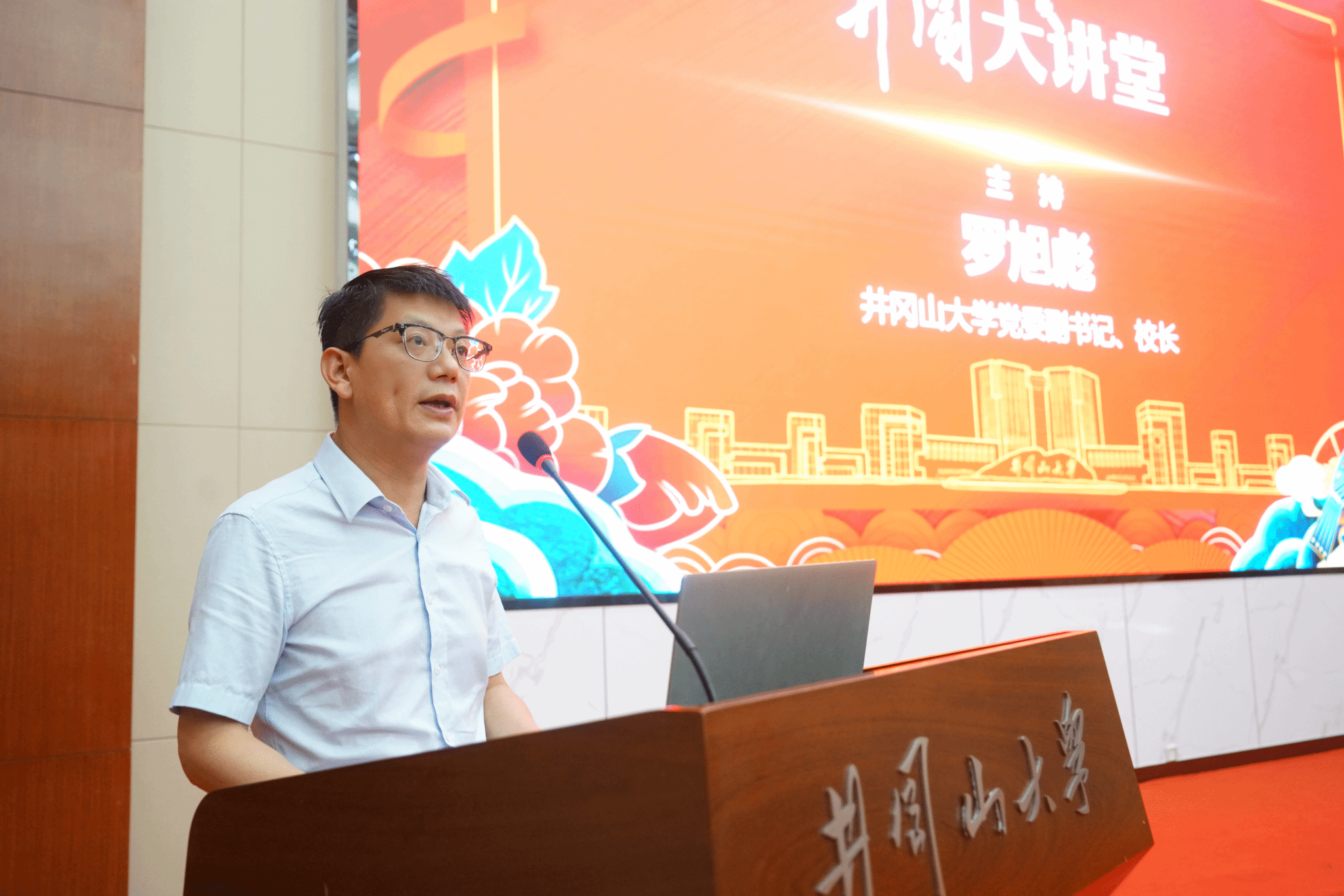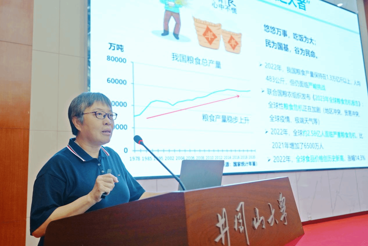 曹晓风以“新型豆科饲草田菁育种与盐碱地改良”为题从国家粮食供需存在结构性短缺(即饲料粮短缺)基本国情引出科学问题,接着在“新时代大食物观”的政策背景下提出建设优质节水高产稳产的饲草料生产基地,进而引出了本次讲座的主题。讲座内容主要包括:边际土地产能扩增机理与藏粮于地的技术模式;羊草生物学特性及遗传转化体系,发掘提高羊草产量关键因子 miR538;优质耐盐碱豆科绿肥田菁的筛选及相关技术推广,如田菁-羊草混播改良盐碱化草地技术等;基于田菁种质资源的品种培育、基因研究等基础工作。此外,曹晓风院士还基于吉安市本土存在的酸化耕地治理问题提出了田菁修复酸性土壤作用的研究思路,为井冈山大学立足于服务地方发展指明了方向。