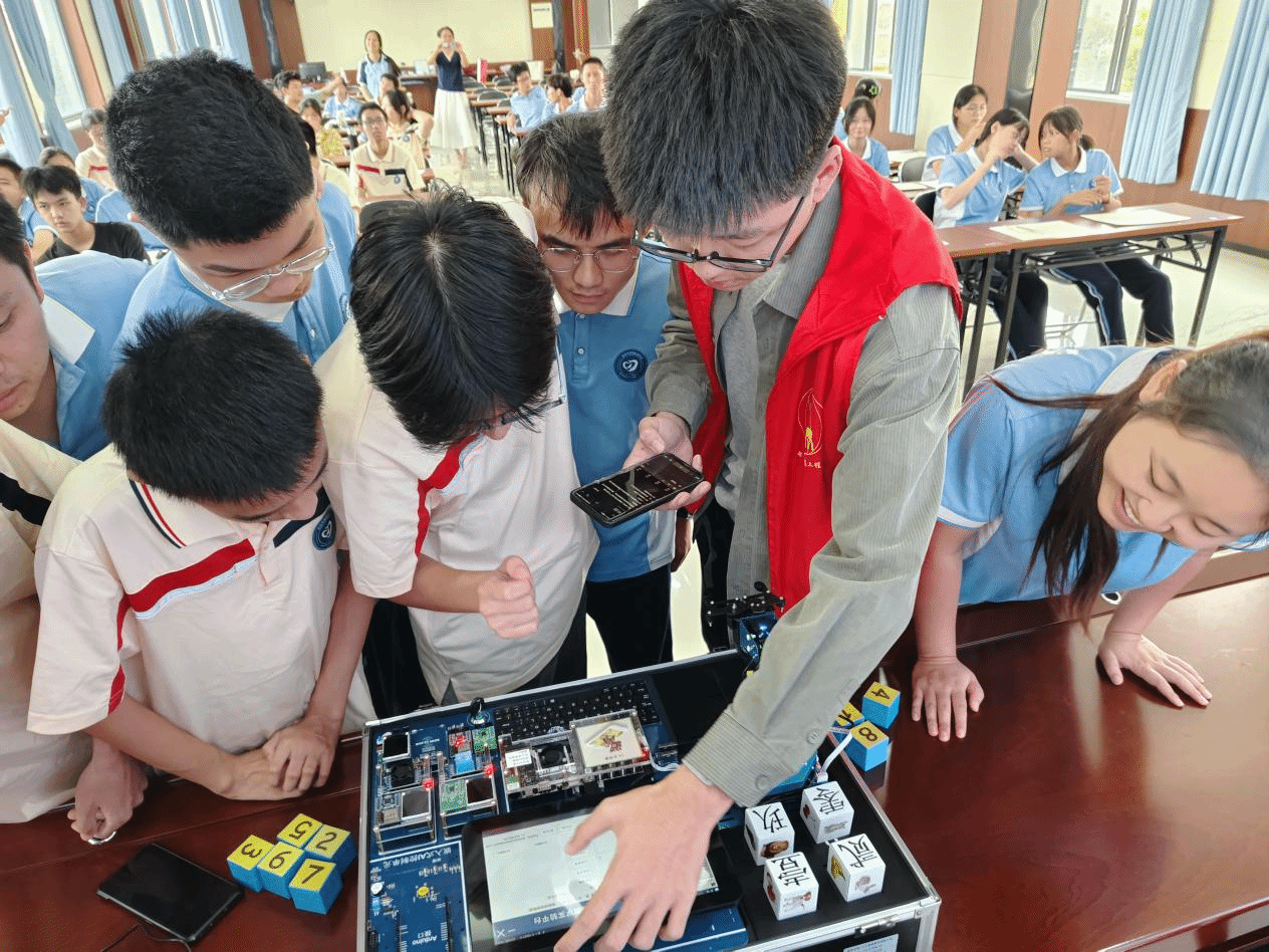 在活动中,志愿者们首先通过科普宣传,向特教学校的孩子们展示了人工智能技术在教育和日常生活中的应用。然后,他们现场演示包括机械臂在内的AI智能实验产品,这些产品能够响应语音指令、识别数字图像,完成仓库货物分拣等精细动作。孩子们亲眼见证了科技的魅力,纷纷踊跃参与现场的实操演练。此外,志愿者们还通过互动绘画的方式,激发学生们对未来科技世界的想象,点燃他们对AI计算机学习的热情。