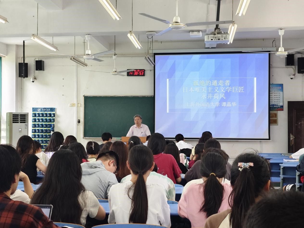 6月13日下午,上海外国语大学二级教授、文学博士、博导谭晶华应邀来到外国语学院,开展题为《孤独的遁走者——日本文学唯美派巨匠永井荷风》的学术讲座,讲座由学院副院长车才良主持,日语专业全体师生聆听了讲座。