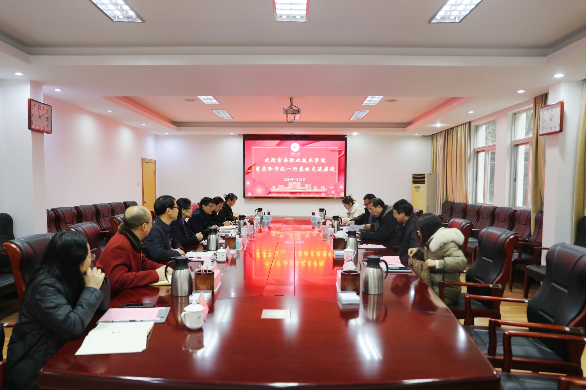 1月20日,吉安职业技术学院党委书记曾志珍率该校有关部门负责人一行来校访问交流。校党委书记胡春晓出席并讲话,校党委副书记、校长罗旭彪主持座谈交流会,党委常委、副校长冷明出席,相关对口部门和学院负责人参加了座谈会。