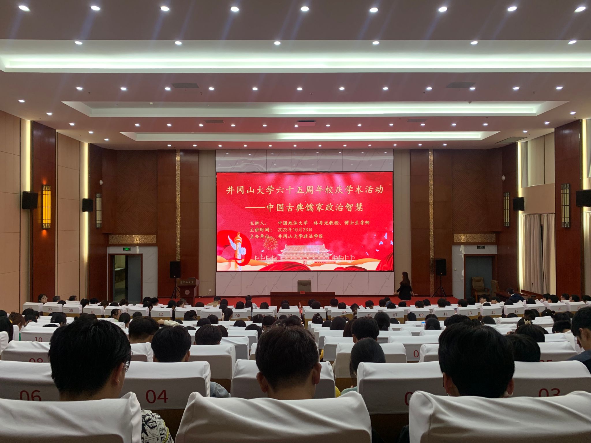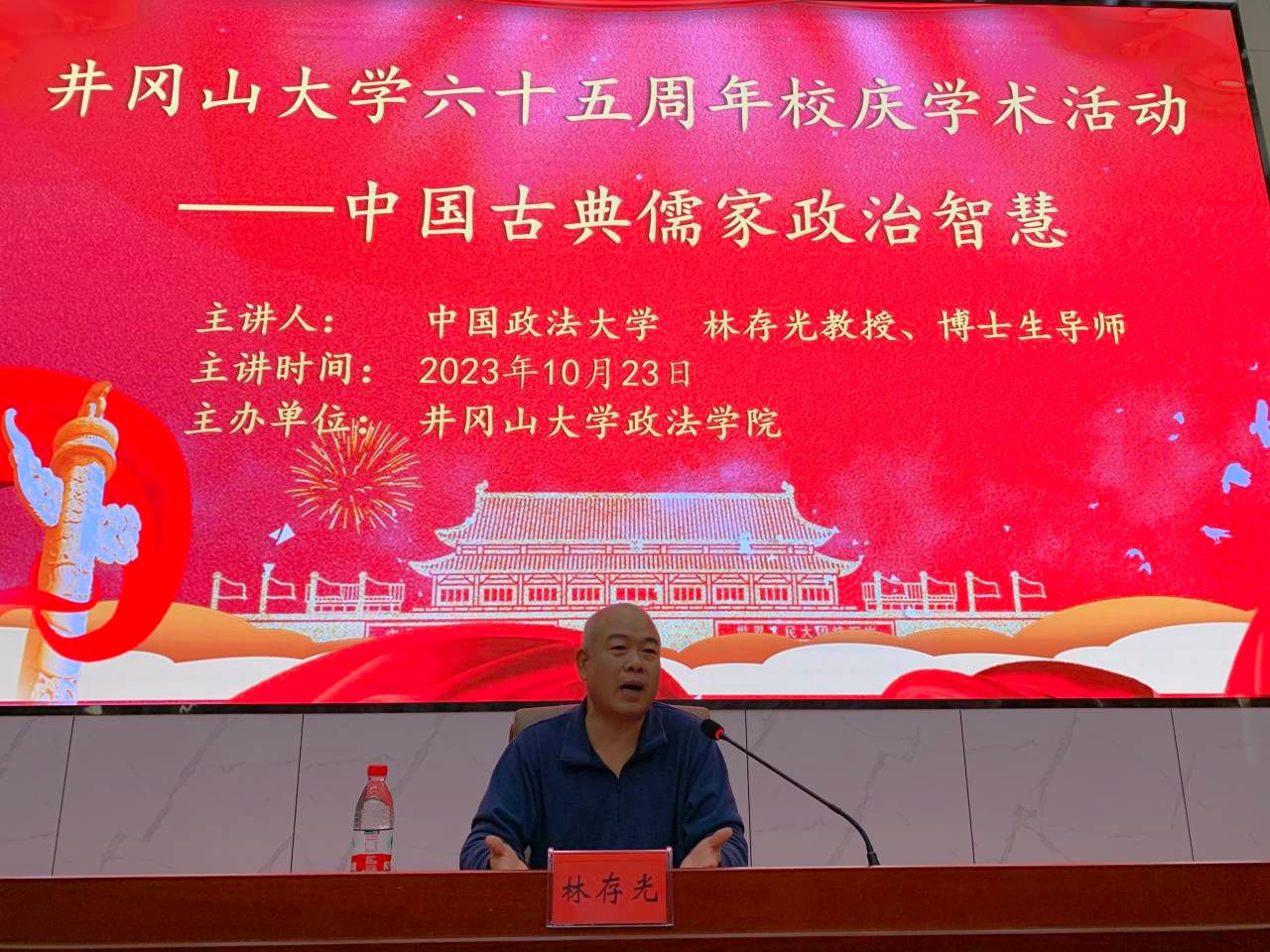 10月23日晚7时整,中国政法大学教授、博士生导师林存光到访井冈山大学政法学院,于北区新图书馆报告厅开展主题为“中国古典儒家政治智慧”的学术讲座。本次学术讲座由井冈山大学政法学院副院长欧阳晓安主持,政法学院师生积极参与。