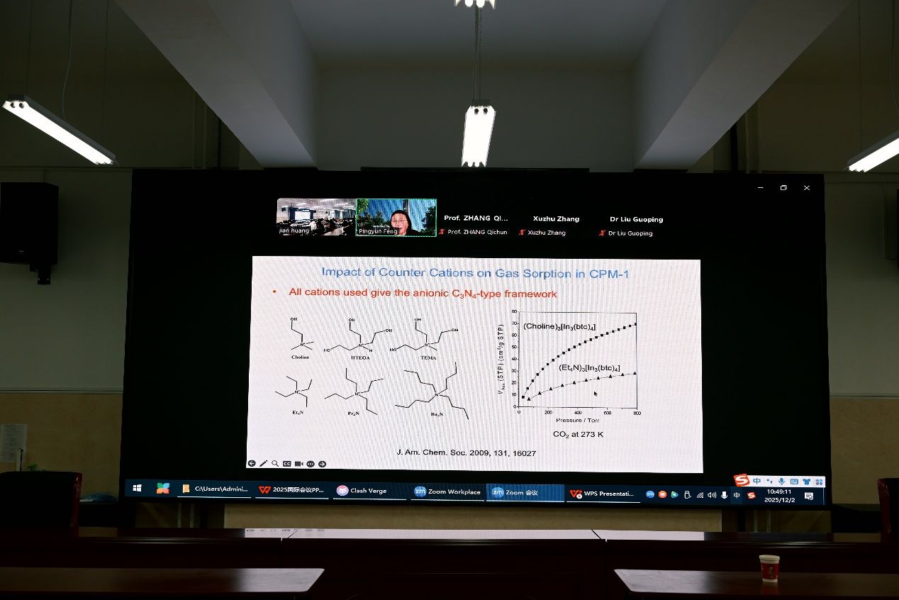 美国加州大学Pingyun Feng教授作了题为“Crystalline Porous Materials through Pore Space Partitioning”的报告。Feng教授的报告聚焦高性能多孔 MOF 材料的合成及孔空间分区策略。Feng教授指出采用孔空间分区策略合成的 MOF 材料,化学稳定性显著提升,且兼具优异的气体吸附性能与低结合能特性。报告还分享了团队近期在 MOF 功能化改性强化气体吸附效果的研究,并探讨如何构建最优孔结构以提升吸附性能。报告指出MOF 材料作为一类极具吸引力的晶体多孔材料,其组成、结构与性能具有高度可调性,为气体吸附相关应用提供了广阔潜力。