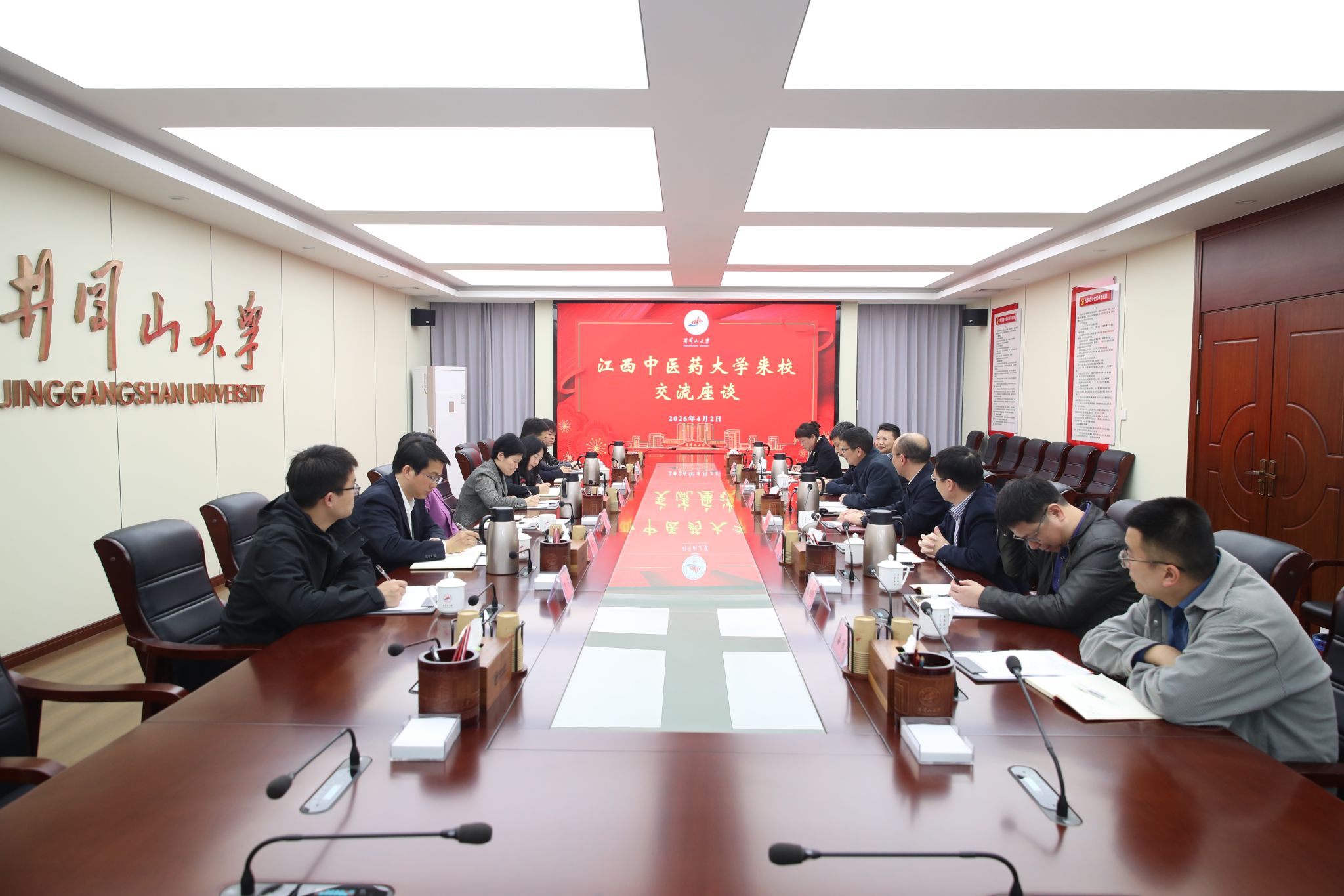 4月2日,江西中医药大学党委副书记、校长朱卫丰,党委委员、副校长钟凌云一行来校,就附属医院发展、实习基地建设等事宜开展考察交流。我校党委书记罗旭彪,党委常委、副校长黄族豪出席座谈会。吉安市卫生健康委员会党委书记、主任刘云峰,以及校地三方相关单位负责人参加会议。