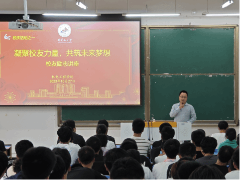 为迎接学校65周年校庆,分享校友的创业经历,帮助学生明确学习目标,做好职业生涯规划。10 月 27 日下午,校友励志讲座在教学楼11栋B208举行。2008 届电力专业校友、武汉虾皮心选服饰有限公司董事长陈国超和 2010 届机制专业校友、江西方舟科技有限公司技术副总王彪受邀作励志讲座。学院红色工匠班学员和各班级学生代表共计200余人参加了讲座。