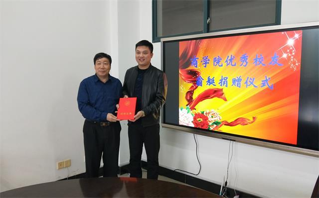 10月22日,我校商学院2010届国际经济与贸易专业校友翁艇向母校捐赠10万元,为母校60周年校庆献礼,主要用于我校商学院学生综合素质发展奖学金。校党委常委、副校长吕玉华代表学校向翁艇颁发了捐赠纪念证书。