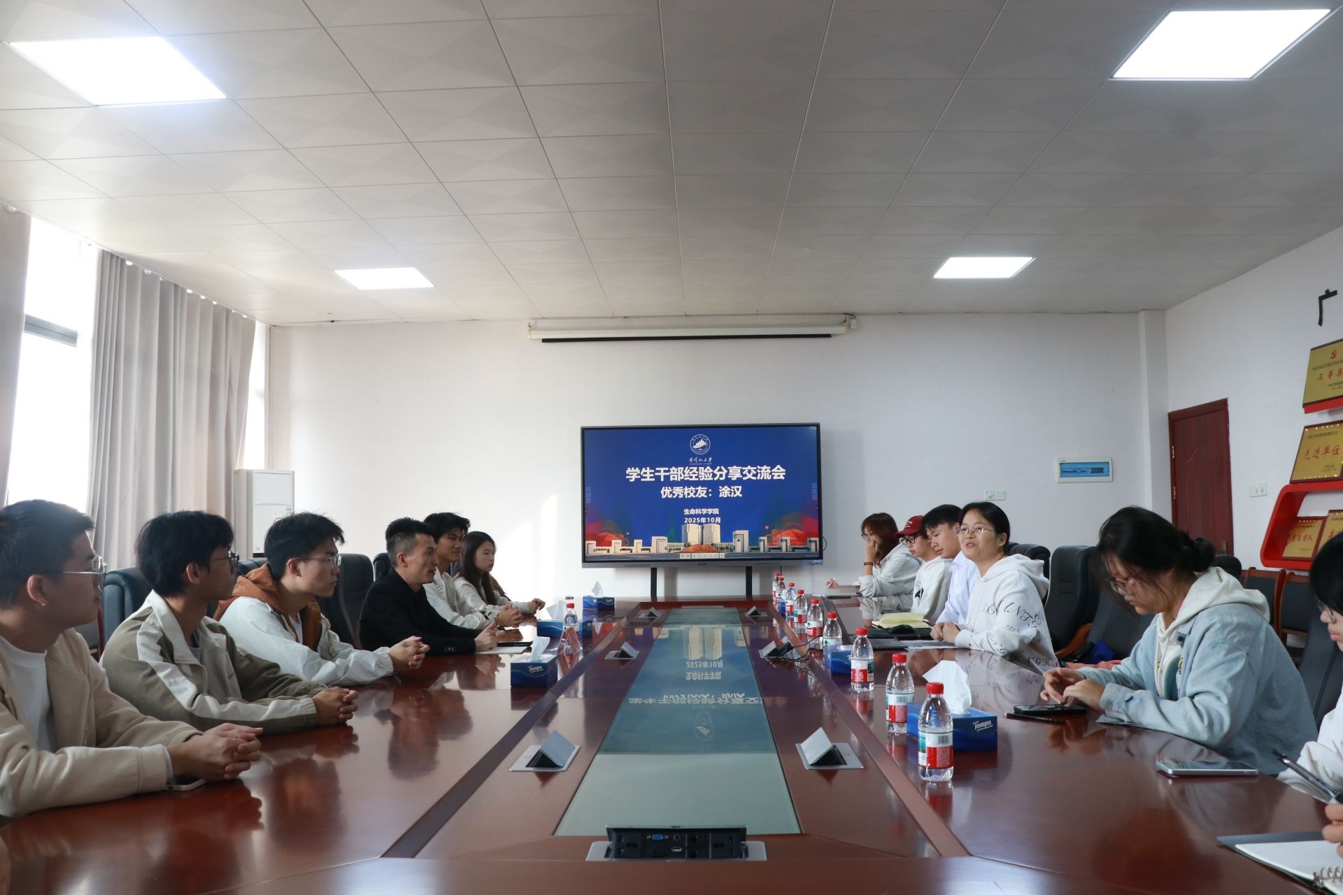 现场互动热烈,学生干部围绕团队协作、压力管理等话题踊跃提问。涂汉以幽默的语言,诚挚的回应赢得阵阵掌声。同学们纷纷表示将以优秀校友为榜样,践行“学业与履职并重”的成长路径。正如参会学生所言:“涂汉学长的故事让我们看到,责任与担当终将转化为破局之力,这正是母校67年薪火相传的精神内核。”(图/文:李佳欣/李敏,审核:钟庄子、肖虹、何旭梅)