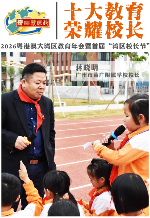 蒋晓明:广州市黄广附属学校总校长,湾区(广东)教育研究院高级研究员,粤港澳大湾区校长行动联盟主席团成员。2026年首届湾区校长节“十大教育荣耀校长”。