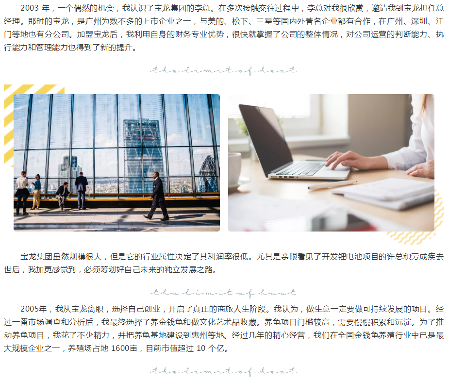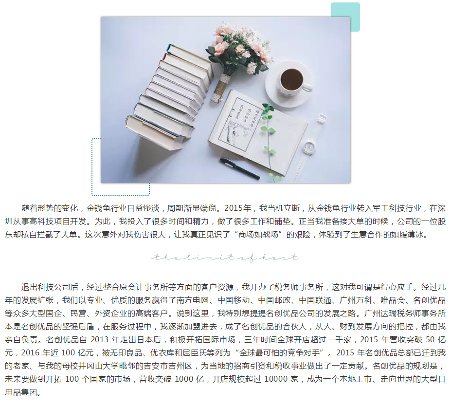 作者现为广东万丰海富科技有限公司董事长、广州市达瑞税务师事务所有限公司董事长、惠州市南海龟业有限公司董事长、名创优品股份有限公司副总裁,广州市人大代表、广州市工商联常委、广州市总商会副会长