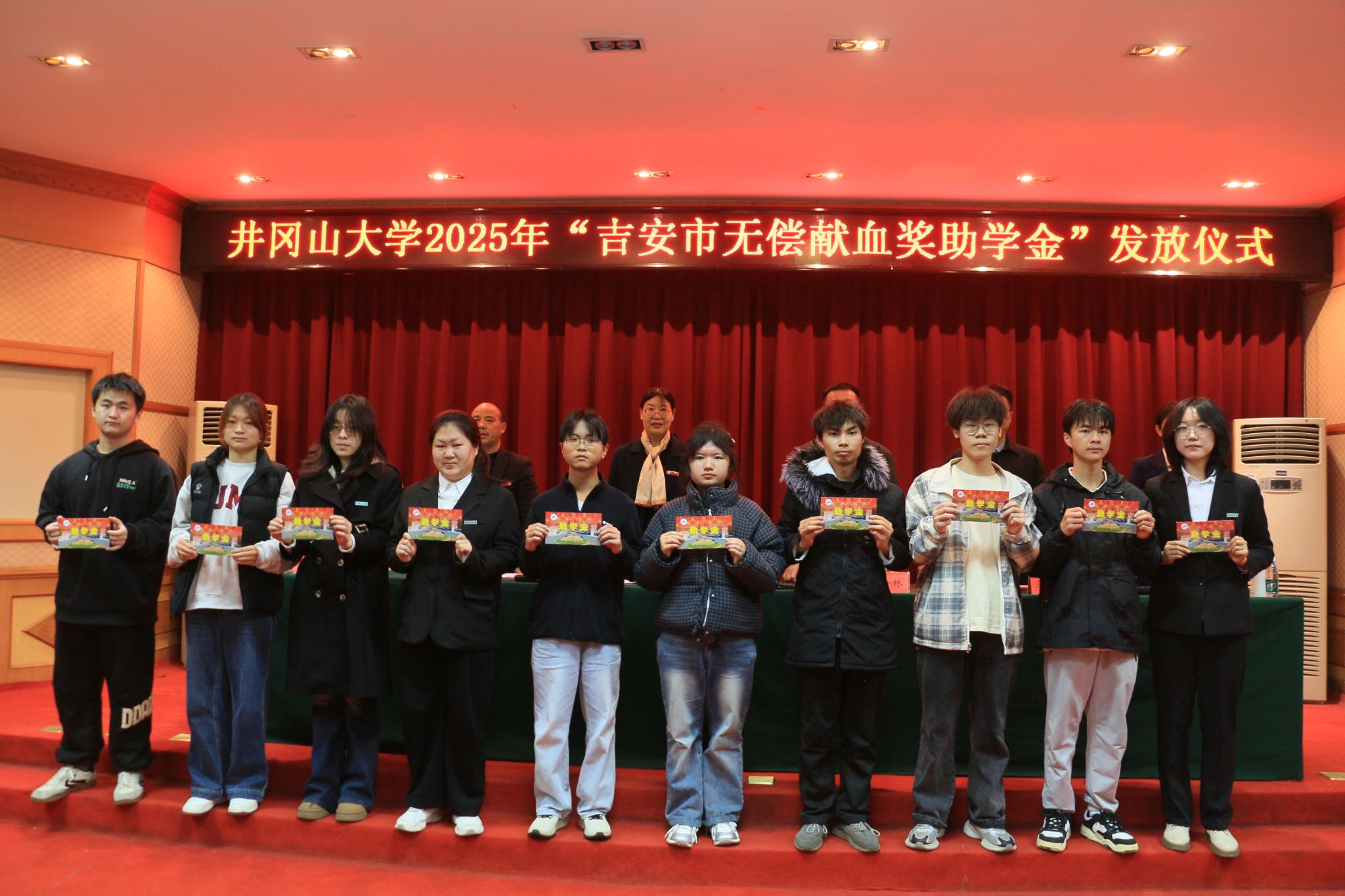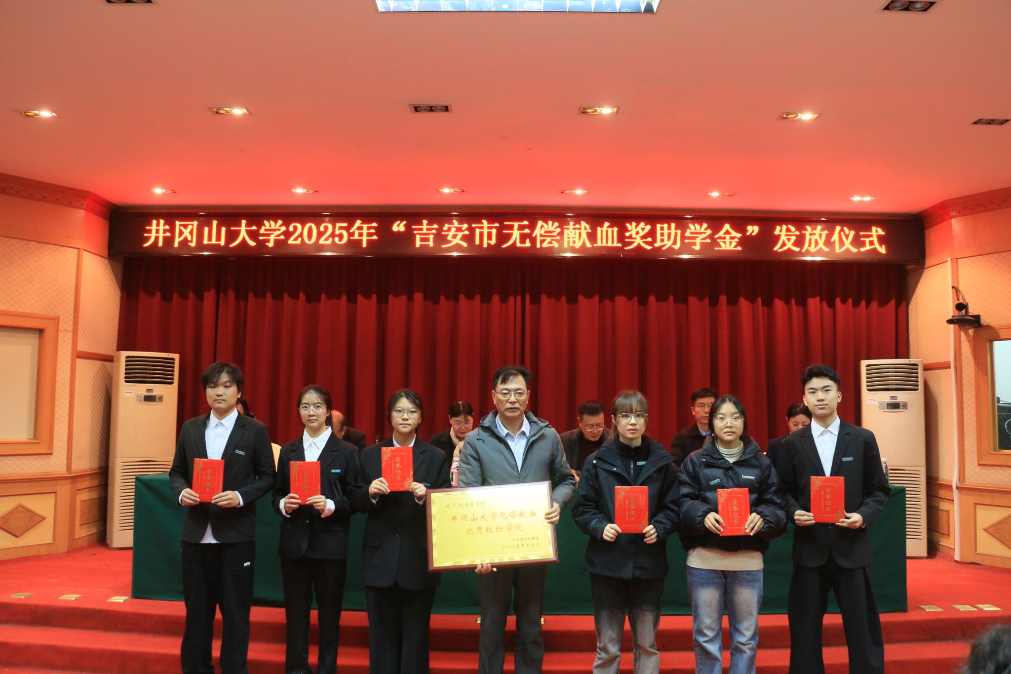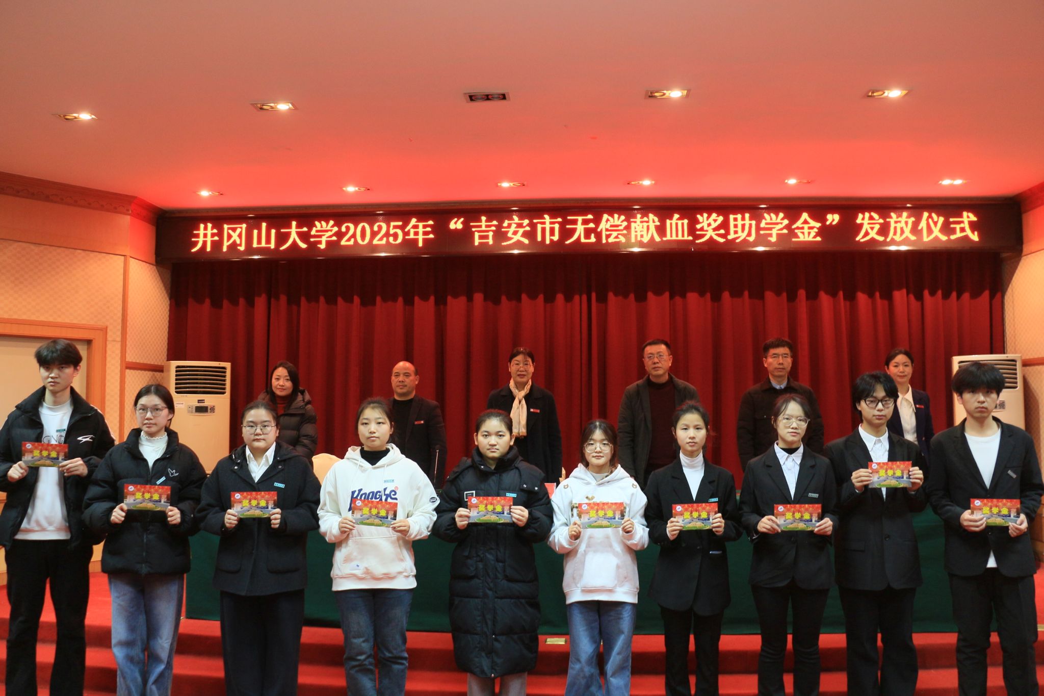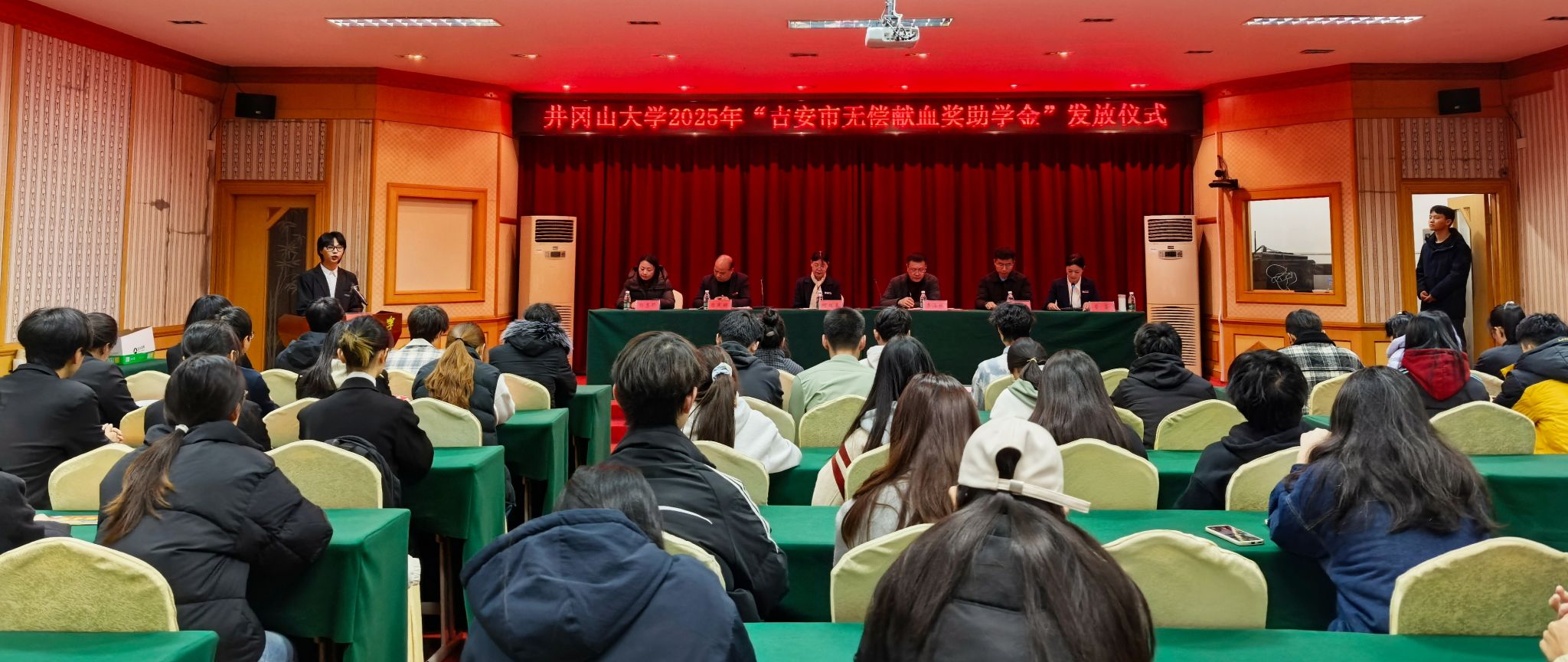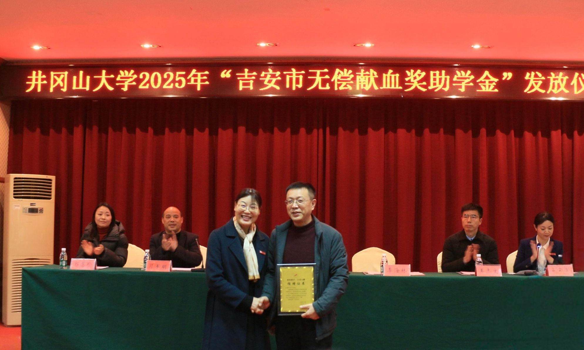 12月24日,我校举行2025年“吉安市无偿献血奖助学金”发放仪式。学校党委常委、副校长何桂春,学生工作部(处)长习军明,吉安市中心血站站长李海林、副站长王志文,以及各学院负责资助工作的老师、获奖助学金的同学、“热血井青公益社团”社员、无偿献血宣传员共计八十余人参加,仪式由学生资助中心副主任雷蕾主持。